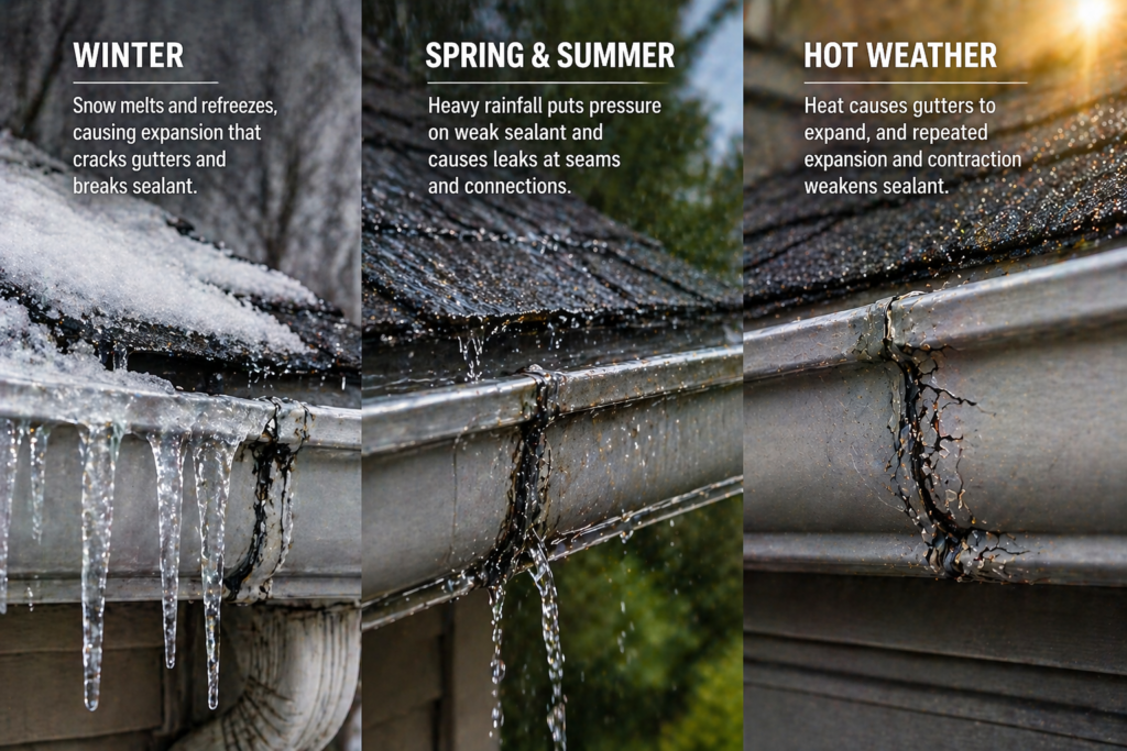 During hot weather, metal gutters expand due to heat. When temperatures drop again at night, they contract. This repeated movement weakens old sealants and causes them to fail.